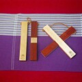 赤色の美しいカリンと黄白色の落ち着いた色合いのミズメザクラのコントラストが鮮やかな鍋敷です。どの方向から見ても紅白が対称に入っているのが特徴的です。 2本組の板をクロスさせて、それぞれの板のくぼみに板を重ね合わせて鍋敷として使用します。 収納時は革紐をフックに吊るして場所をとらずに収納できます。鍋敷で使う時のサイズは長辺が20cmなので鍋の底辺を考えてご使用ください。